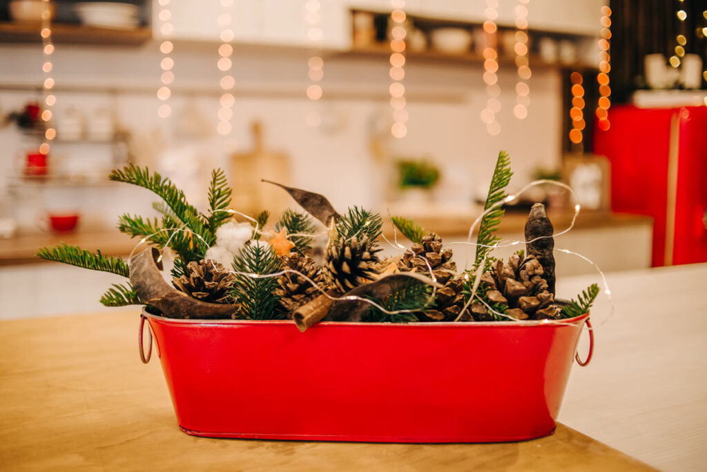 Il centrotavola realizzato con un recipiente di latta riempito di pigne, foglie e luci bianche è davvero l’idea che semplice che rivoluziona lo stile della mensa.