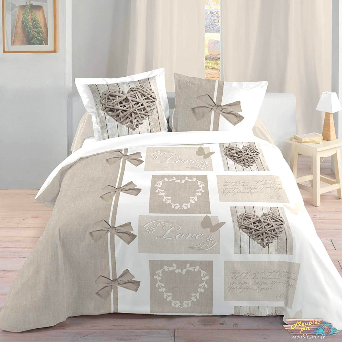 Un copripiumone realizzato sui toni del marrone e del bianco con decori propri dello stile shabby chic. Può essere utilizzato in qualsiasi camera da letto per dare un tocco di raffinatezza all’ambiente.