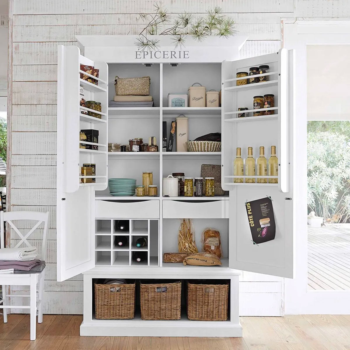 Questa proposta di Maisons du Monde invece è un armadio chiuso nella parte alta, dove poter raccogliere e mantenere in ordine tutta la dispensa, grazie ai monti ripiani e ai molti scomparti. Nella parte bassa è invece stato lasciato un vano a giorno che possiamo sfruttare utilizzando delle ceste in vimini.