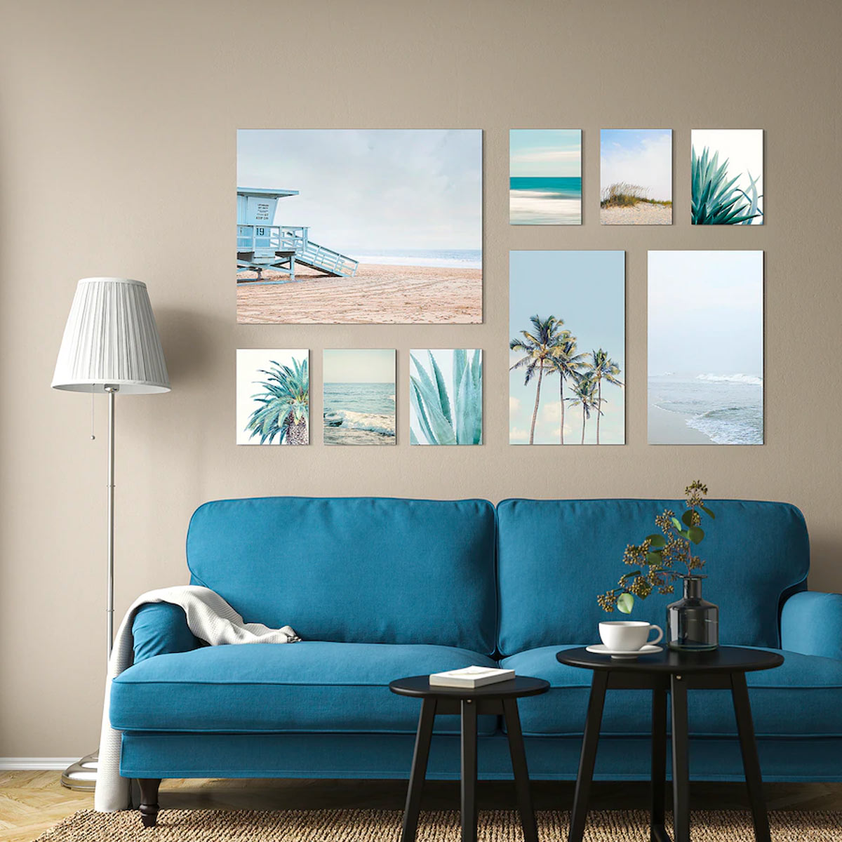 Una selezione di stampe con lo stesso tema, ma soprattutto con la stessa palette cromatica è una decorazione per la parete dietro il divano che può riempire anche spazi davvero ampi. Infatti la si può comporre come si vuole e si possono aggiungere più quadri di dimensione differente ottenendo questo effetto mosaico.