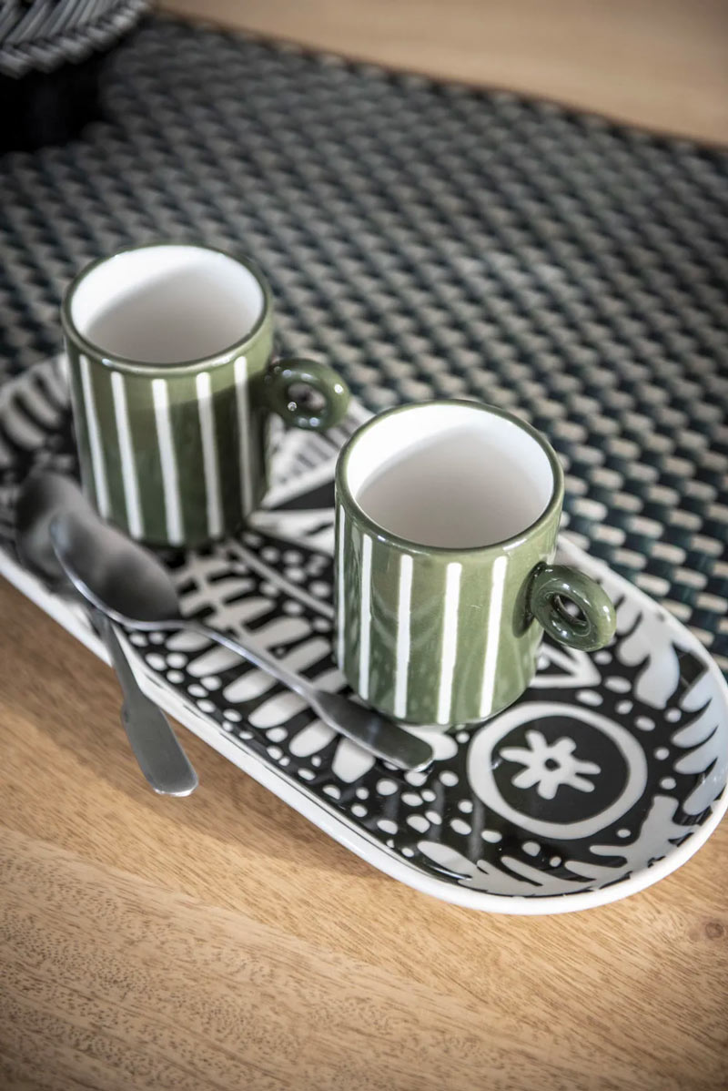 Se invece desiderate rendere speciale l’ora del tè per chiacchierare con stile con gli amici, ecco le tazzine e le teiere perfette. La prima proposta è questo vassoio completo di due tazze gemelle per gustarsi un tè caldo in compagnia. Il verde è anche in questo caso il colore principale. Il vassoio da torta è perfetto per servire le tazze oppure per essere utilizzato come vero e proprio porta torta.