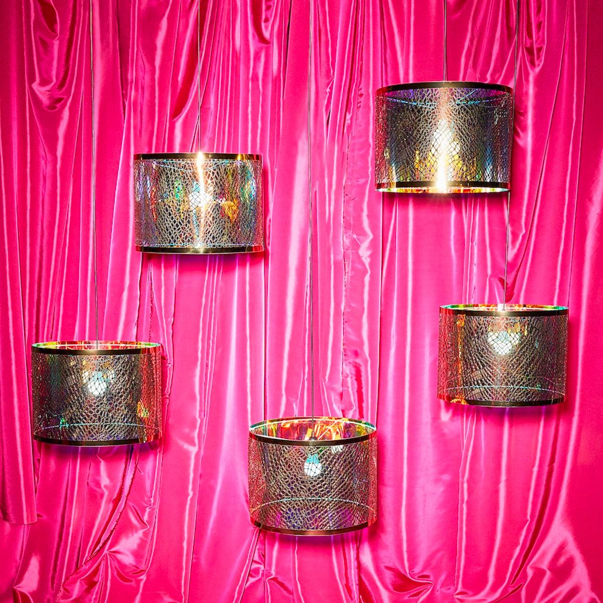 Il paralume della collezione KARISMATISK ha un gioco di reticolo davvero intrigante. Il colore è oro, ma con i riflessi della luce cambia colore ed è quali camaleontico. Lo stesso paralume può essere utilizzato anche per realizzare una lampada a stelo, per un soggiorno davvero glamour.