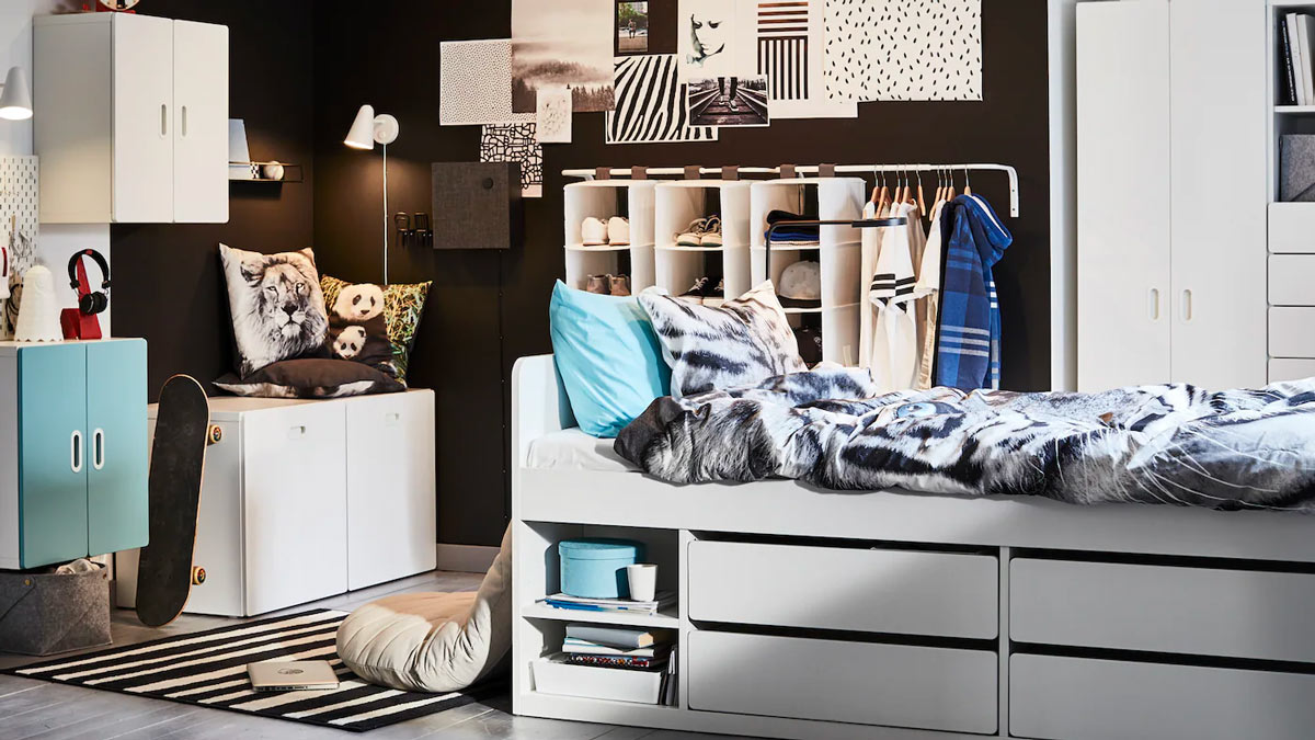 Una cameretta per adolescenti, glamour e funzionale, che permette loro di organizzare al meglio la quotidianità, esprimendo passioni, esigenze e tutto quel vasto mondo in trasformazione! Ikea cresce con loro.