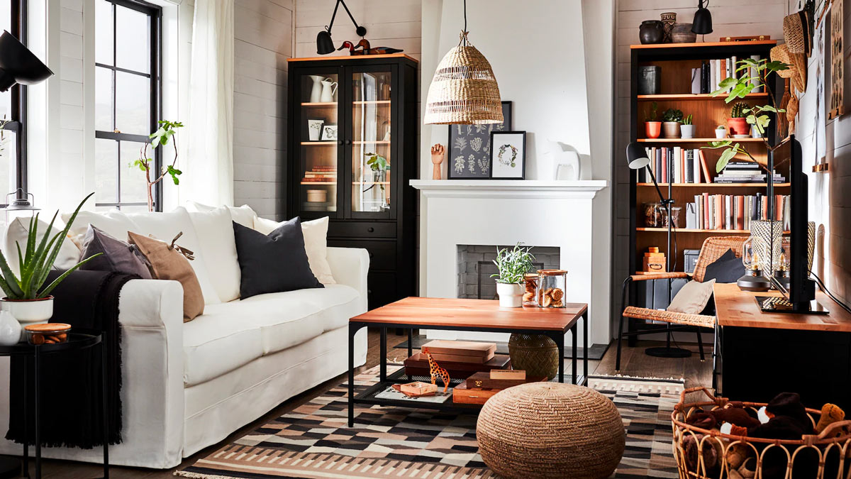 Un rustico dal piglio contemporaneo per questo salotto nel quale il bianco del divano è messo in risalto dagli arredi in legno, sia chiaro che scuro. Anche il rattan dei complementi gioca un ruolo importante: un contesto dal forte impatto visivo.