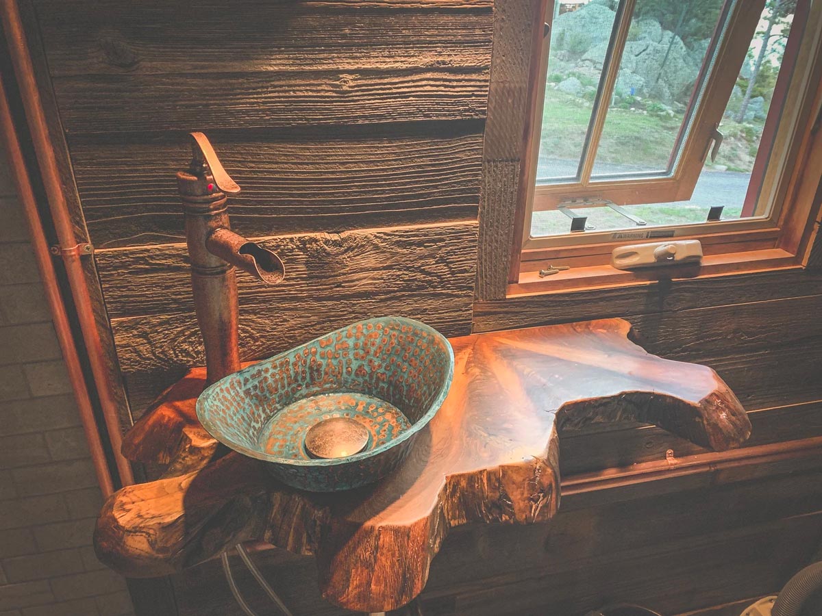 La bellezza autentica di un passato lontano ma sempre attuale. In questo bagno country trionfa il legno e il lavandino di rame è valore aggiunto.
