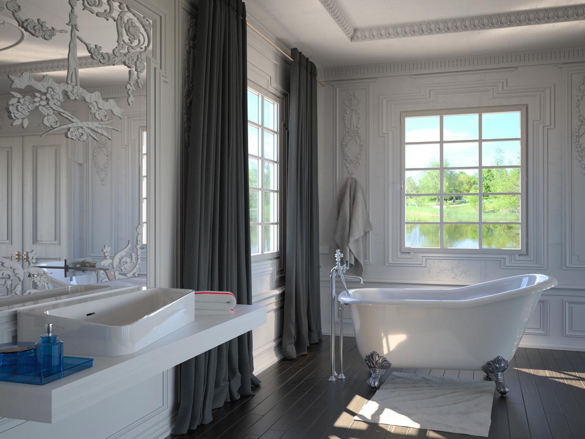 Uno stile country, in questo bagno, che punta sulle note della classicità. Stucchi e ispirazioni romantiche, in un ambiente in cui il bianco ed il grigio sono sinonimi di raffinatezza.