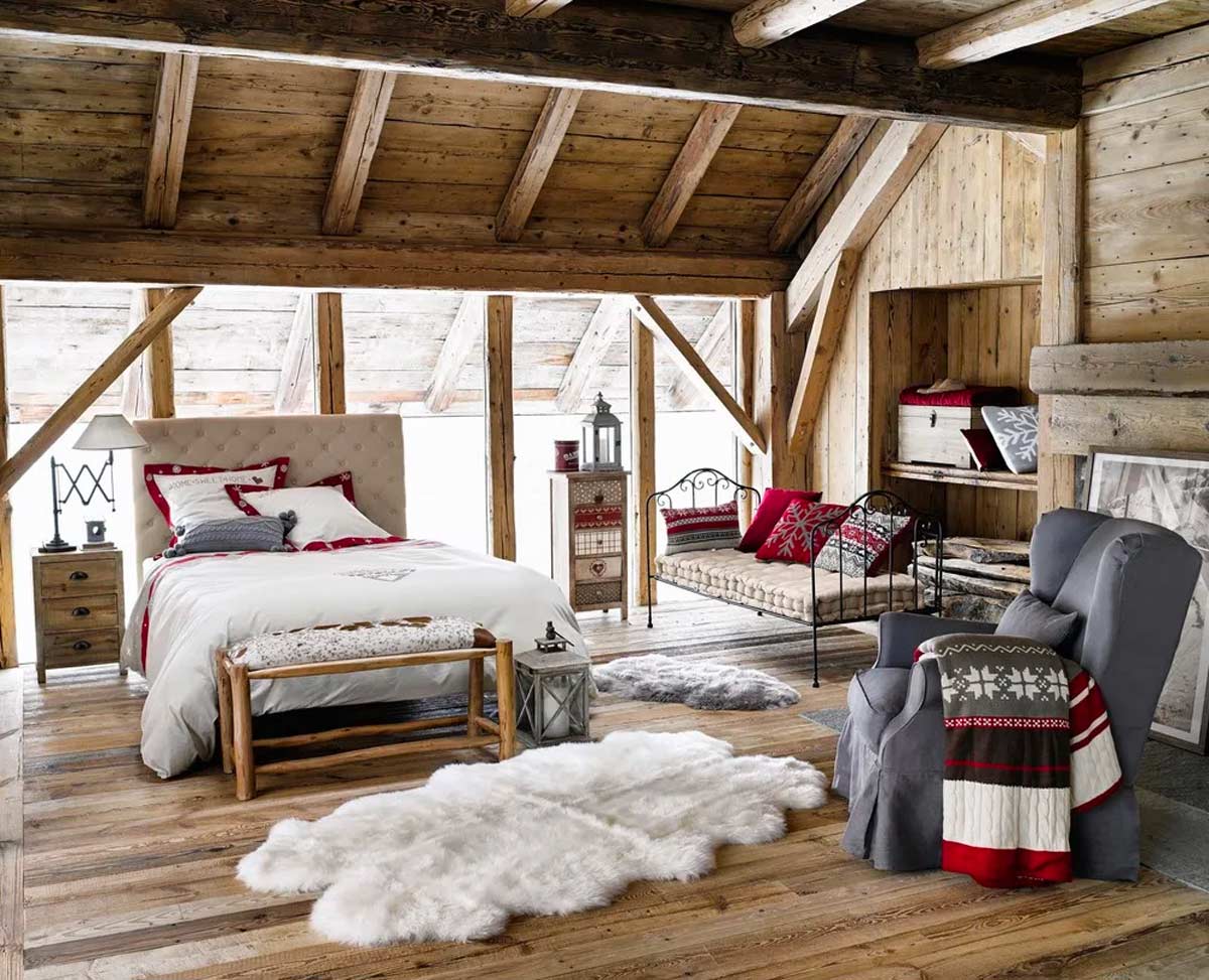 Infine uno chalet proposto da Maison du Monde fra divanetti canapè in ferro battuto, soffici velli di pecora ecologici e uno spettacolare parquet in legno invecchiato.