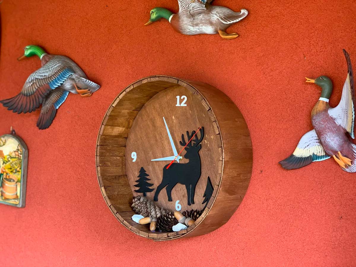 Un orologio dallo stile montano può essere realizzato da una sezione di una piccola botte. Il meccanismo è facilmente reperibile nel web e può essere decorato con delle sagome di cervi. Le pigne e le ghiande decorano con gusto questo orologio da parete.