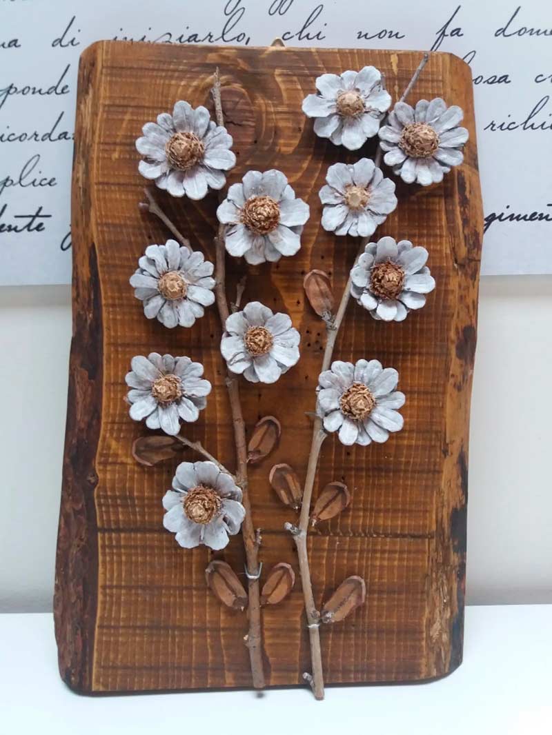 Lo sapevate che con le pigne si possono realizzare dei bellissimi fiori? Per farlo basta togliere i petali delle pigne fino a lasciarne solo un paio di file. Dipinte di differenti colori possono poi essere posizionate su un supporto in legno per ottenere un bel quadro di decorazione da appendere a parete.