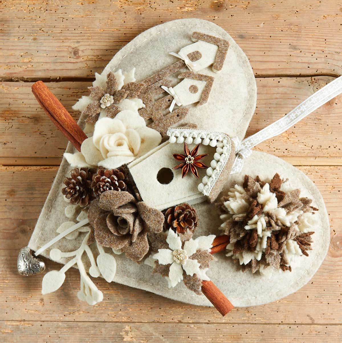 Le pigne ben si adattano anche per realizzare decorazioni dall’aspetto shabby chic. Un cuore di panno lenci imbottito, fiori e casine possono realizzare una decorazione da appendere a parete davvero bella. Le pigne sono il tocco in più per rendere la composizione originale.
