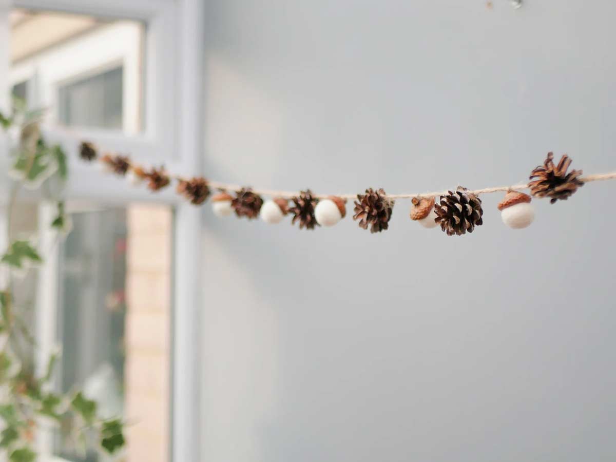 Fissare le pigne ad un filo di spago e intervallarle a delle ghiande crea un bel festone da appendere a parete dall’aspetto autunnale. Facile da realizzare ma di forte potere decorativo.
