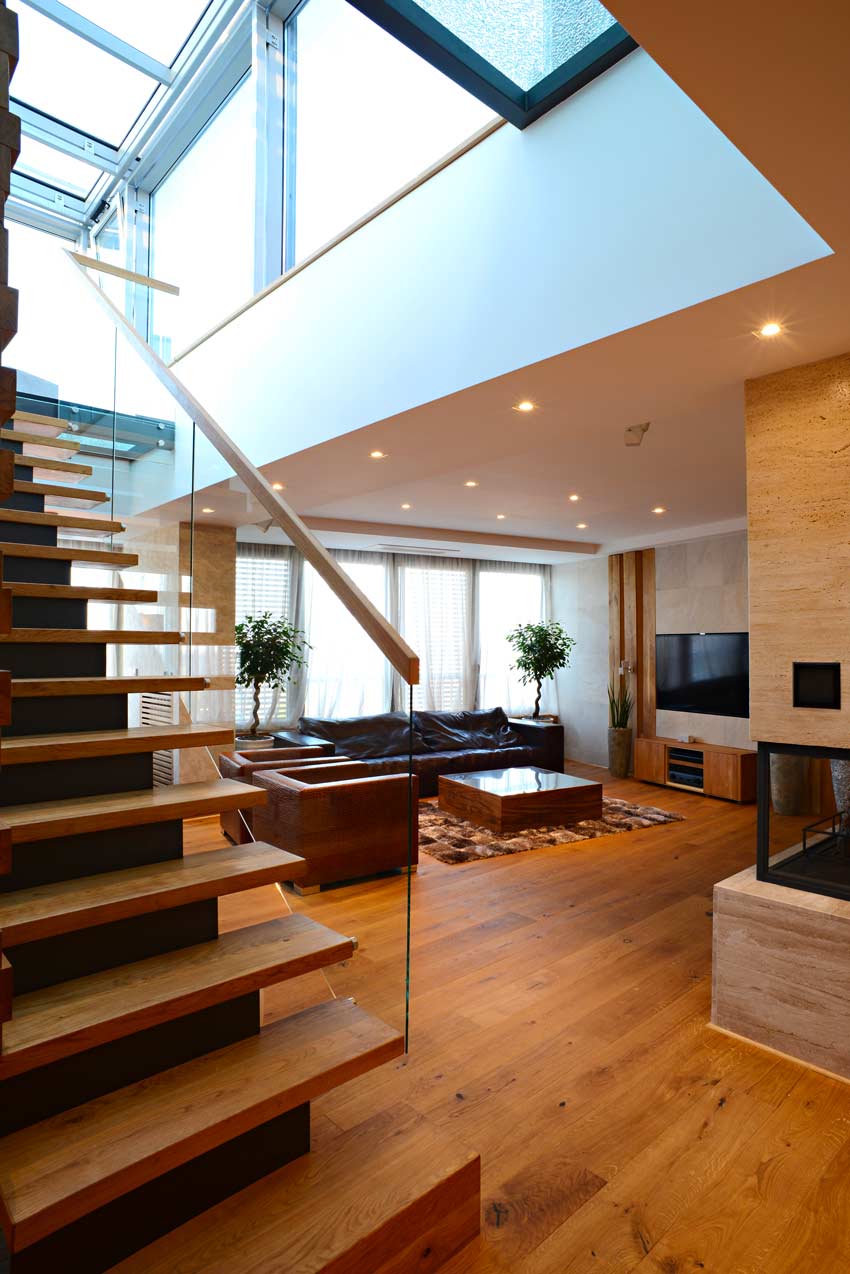 In questi casi la ringhiera in vetro dà un senso di spazio arioso ma al contempo offre un tocco moderno e contemporaneo all’ambiente.