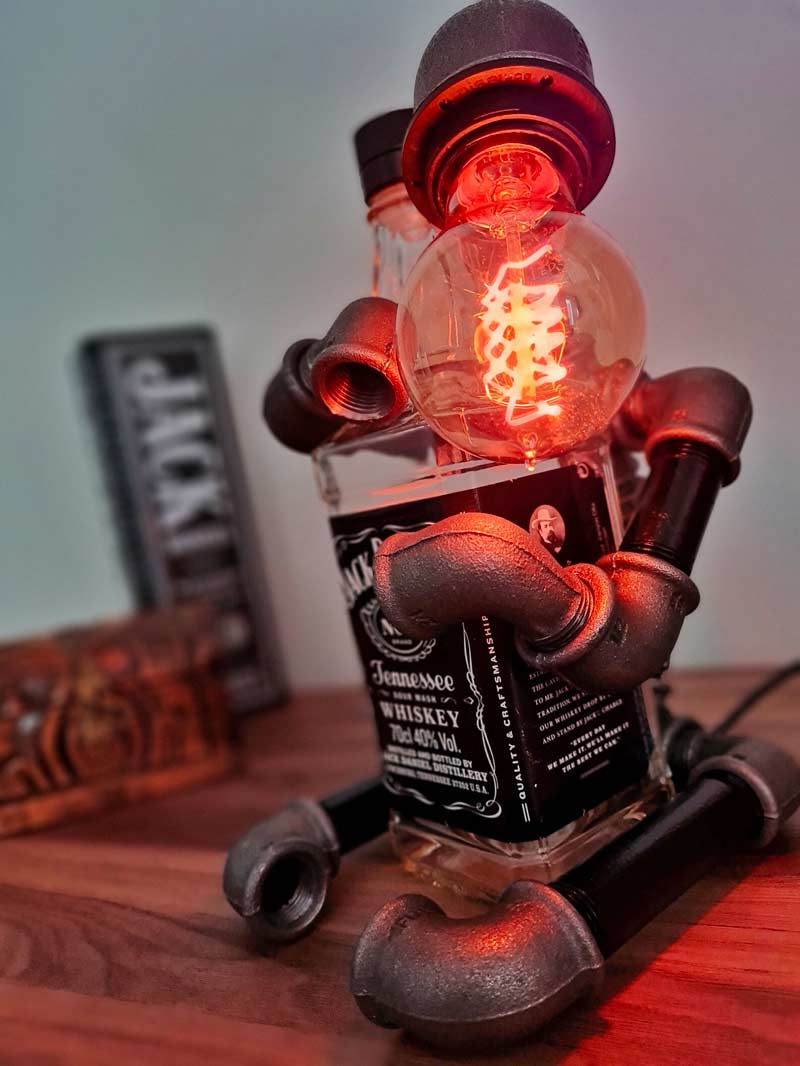 Che ne pensate di questo simpaticissimo abat-jour? La bottiglia di vetro è posizionata al centro è stato costruito questo omino con i tubi idraulici. La testa del soggetto è la lampadina stessa. Davvero originale|