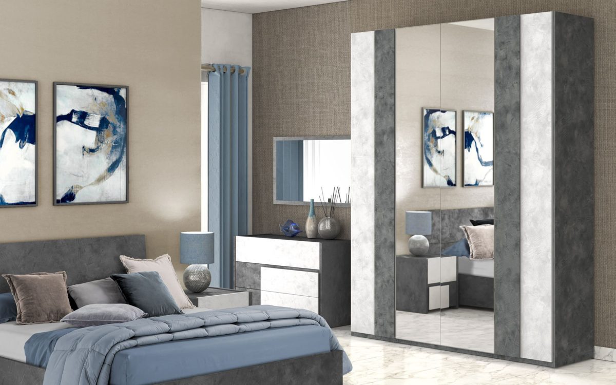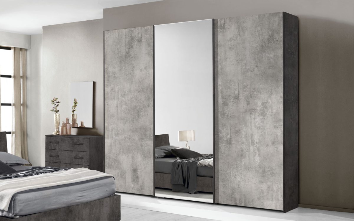 Armadio a 3 ante scorrevoli con specchio centrale, Elena è estremamente elegante. Al suo interno potete trovare 3 ripiani e 6 tubi appendiabiti. I colori disponibili sono: ossido/cemento, cemento/ossido, stucco veneziano piombo/stucco veneziano bianco.