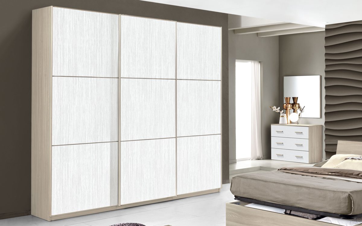 All’interno trovate 3 ripiani e 6 tubi appendiabiti e all’esterno avete un armadio a 3 ante scorrevoli. I colori disponibili sono ben 10 e cioè: effetto olmo perla/bianco larice, effetto beton grey/bianco opaco, noce stelvio/nero frassinato, beton dark/beton grey, ghisa/effetto quercia bianca, noce stelvio/maniglie nero opaco, ghisa/effetto quercia naturale, nero frassinato/maniglie noce stelvio, effetto quercia naturale/maniglie nero opaco, effetto quercia naturale/bianco opaco.
