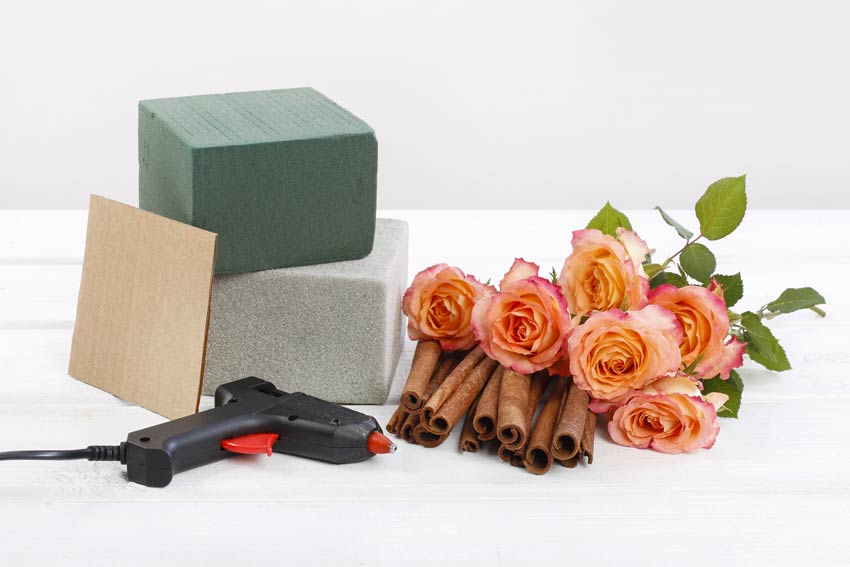 Avrete bisogno di un gran numero di stecche di cannella, un paio di spugne per fiori recisi su cui infilerete i vostri fiori, una sottile base di cartone e naturalmente la colla a caldo. Molto più facile da realizzare di quanto si creda!
