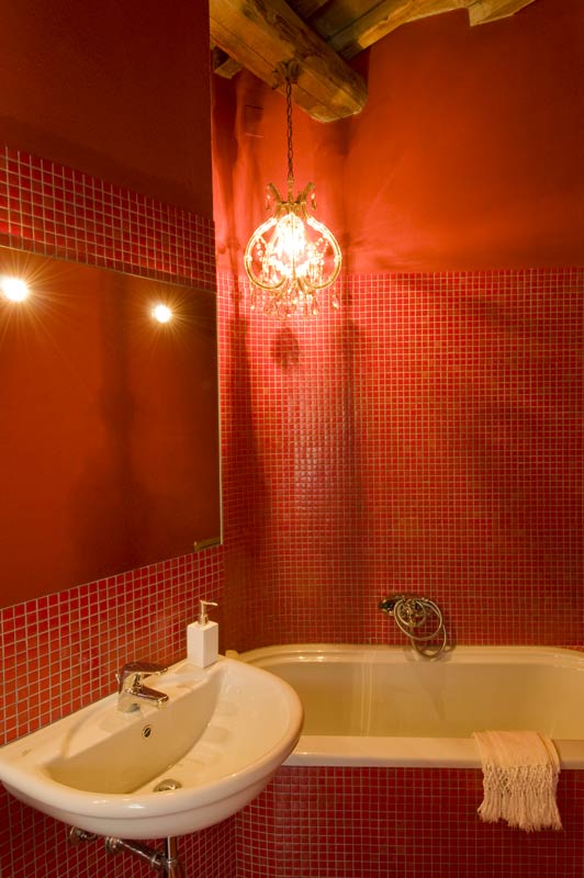 Il rosso può essere utilizzato come nella foto per toilette extra-lusso in abbinamento con un lampadario di cristallo con pendenti a goccia. Inoltre si possono abbinare degli accessori in vetro come portasapone, dispenser e portasciugamani.