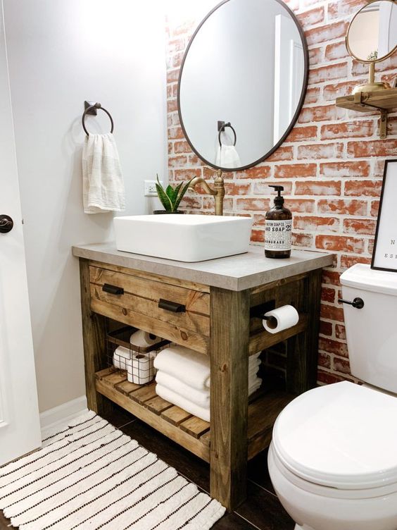 Una parete di mattoni a vista è in grado di emanare il calore tipico degli ambienti rustici. Se non volete caricare troppo la stanza da bagno, potrete aggiungere mobili in legno dal taglio più moderno ed essenziale.