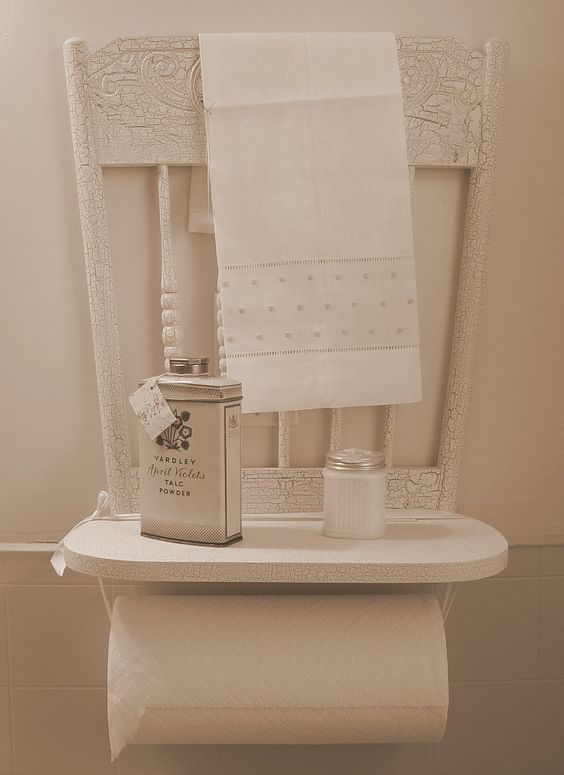 Lo schienale della vecchia sedia della nonna, in stile provenzale, diventa una mensola elegantissima da posizionare nel vostro bagno shabby chic. Sulla parte superiore potete appendere l’asciugamano e sulla sedia appoggiare oggetti e utensili vari. Con del raso potete creare anche un porta rotoli, da mettere al di sotto della struttura. Una sedia e tre usi diversi: magnifica soluzione d’arredo.