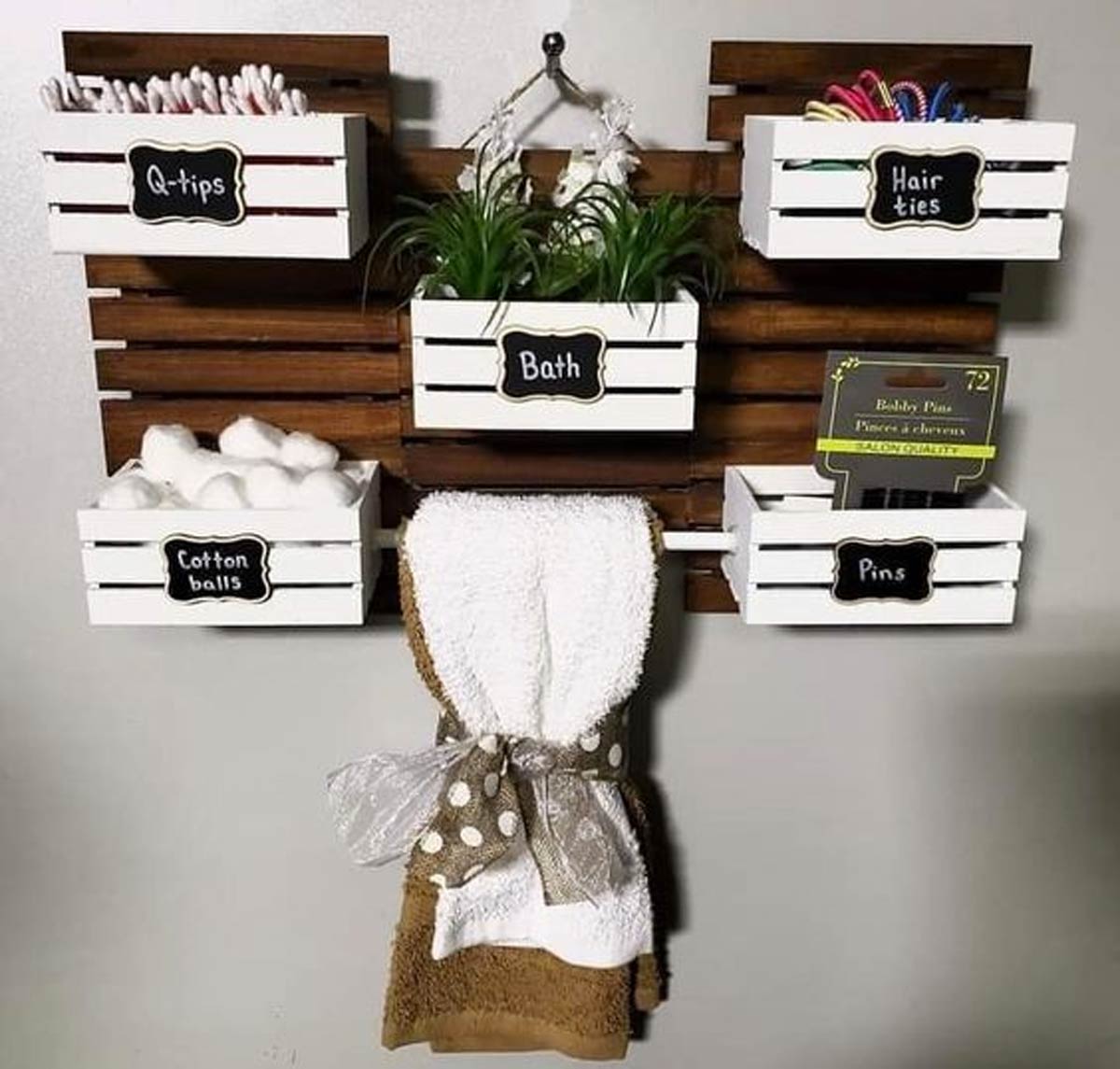 Che idea magnifica quella di riciclare le cassette di legno come porta oggetti da riporre in bagno. Montatele su una base costituita da un bancale di legno che poi appenderete al muro. Il supporto stesso diventa un elemento di design. Dipingete le cassette di bianco e poi incollate sul davanti delle piccole lavagnette con sopra il nome delle cose che vi conservate all’interno. Nella cassetta centrale potete mettere delle piante, per un puro effetto decorativo.