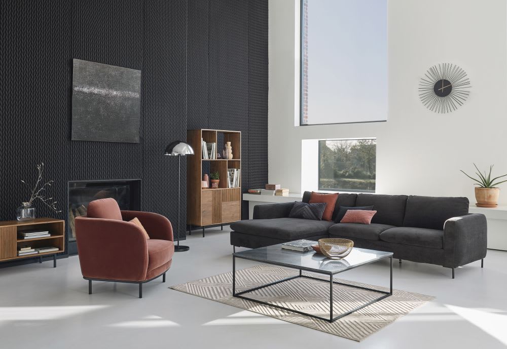 Come abbiamo già detto, la bellezza dell’arredamento di un salotto in nero è quella di poter essere associato a qualsiasi tipologia di materiale, come il legno.
