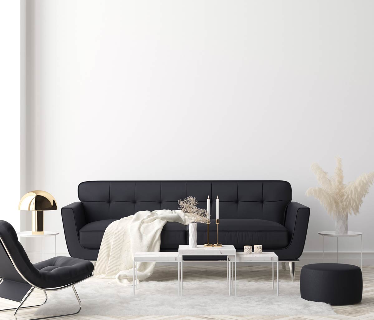 Un suggerimento può essere quello di utilizzare il nero per i divani e alcuni complementi d’arredo e oggetti vari e il bianco per le pareti e i pavimenti, in modo da illuminare la stanza.