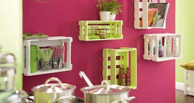 Il punto di forza dell’idea seguente è, senza dubbio alcuno, rappresentato dai colori! Dipingete le vostre cassette di legno e appendetele su un muro della cucina colorato e otterrete una parete attrezzata allegra e moderna.