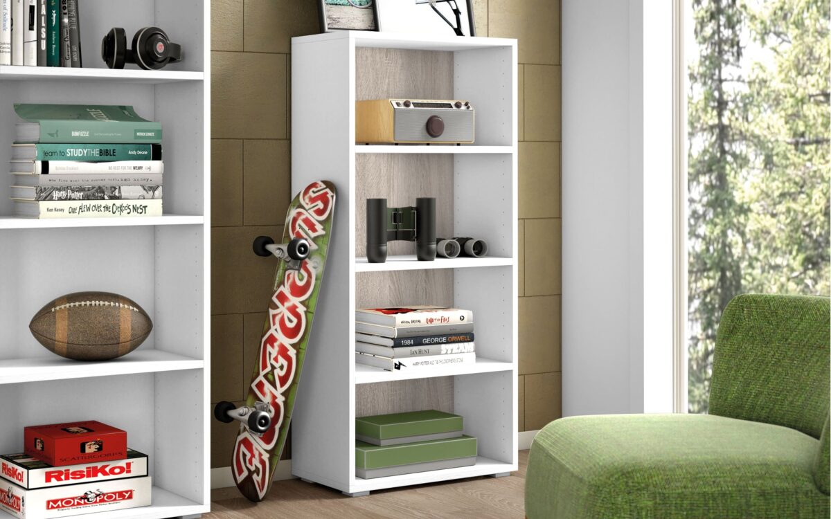 Line è una libreria con 3 piani regolabili, di dimensioni 60 x 30 x 130 cm, in 3 colori disponibili (bianco con fondo cemento, bianco, bianco con fondo effetto rovere).