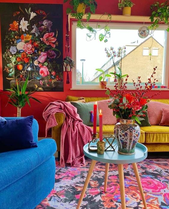 Il divano giallo senape è ben messo in evidenza lungo la parete rossa, sulla quale si apre una finestra circondata da quadri e piante che aggiungono altro colore. Il divano  blu “carta da zucchero” che gli sta di fianco, crea uno stacco  di enorme impatto visivo.