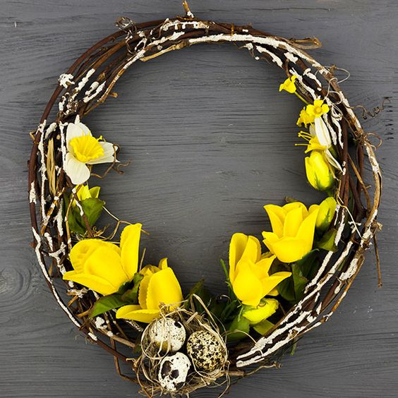 Prendete dei rami secchi, magari mentre passeggiate in campagna o in un bosco. Poi, intrecciateli, in modo da formare un cerchio e teneteli insieme con delle fascette o con del ferro dolce. Successivamente, incollateci sopra dei fiori finti (che sicuramente durano di più e sono più adatti allo scopo), degli ovetti fatti da voi, dei pulcini o qualunque altra cosa possa trasformare la vostra ghirlanda in una perfetta decorazione pasquale. Potete da appenderla alla porta d’ingresso come segno di benvenuto o in casa, per decorare una parete o la porta di una stanza.