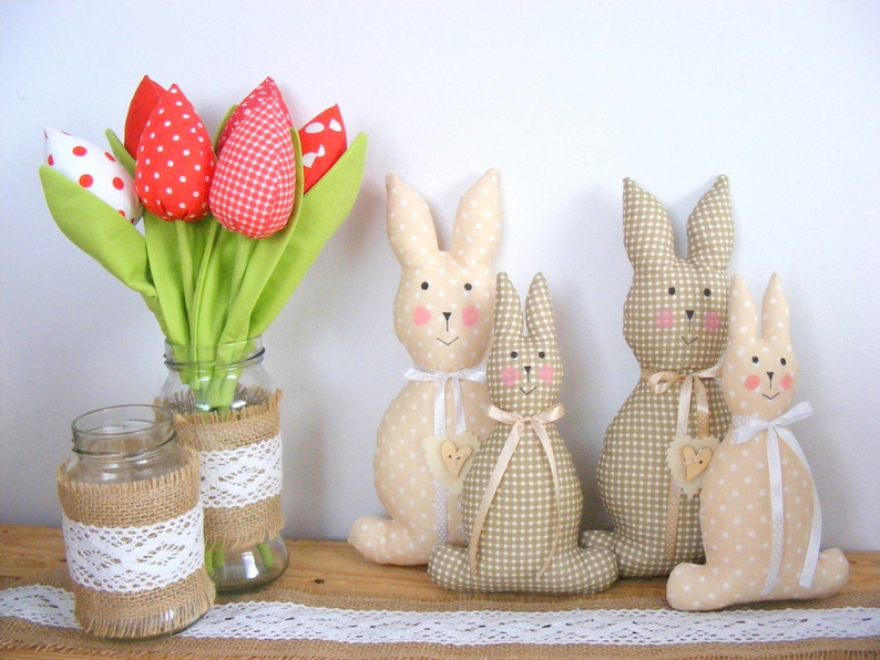 Ritagliate la forma di un coniglietto sulla carta e poi posizionate il cartamodello sulla stoffa che avrete scelto. Ricavatene due forme di stoffa che poi cucirete lasciando aperto un lato che serve per l’imbottitura. Riempite il coniglietto con ovatta o spugna. Poi, disegnate gli occhietti, il nasino, la boccuccia e le guance rosa con un pennarello indelebile (meglio evitare pezzi mobili che i bambini potrebbero ingerire) e completate con un bel fiocco colorato al collo.