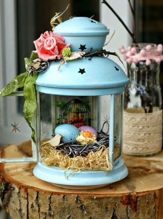 Riutilizzate la vostra lanterna, quella che magari tenete su una mensola e che non vi sembra più così attraente. Se il suo colore originario non vi soddisfa, sceglietene uno che rimandi alla natura, magari un celeste polvere come questo nella foto. Poi, riempitela di raffia, ovetti colorati, fiori fonti, rametti secchi e magari qualche pulcino. Ci vuole poco a creare una decorazione pasquale con il riciclo creativo che, all’occasione, diventa anche un bel regalo per amici e parenti.