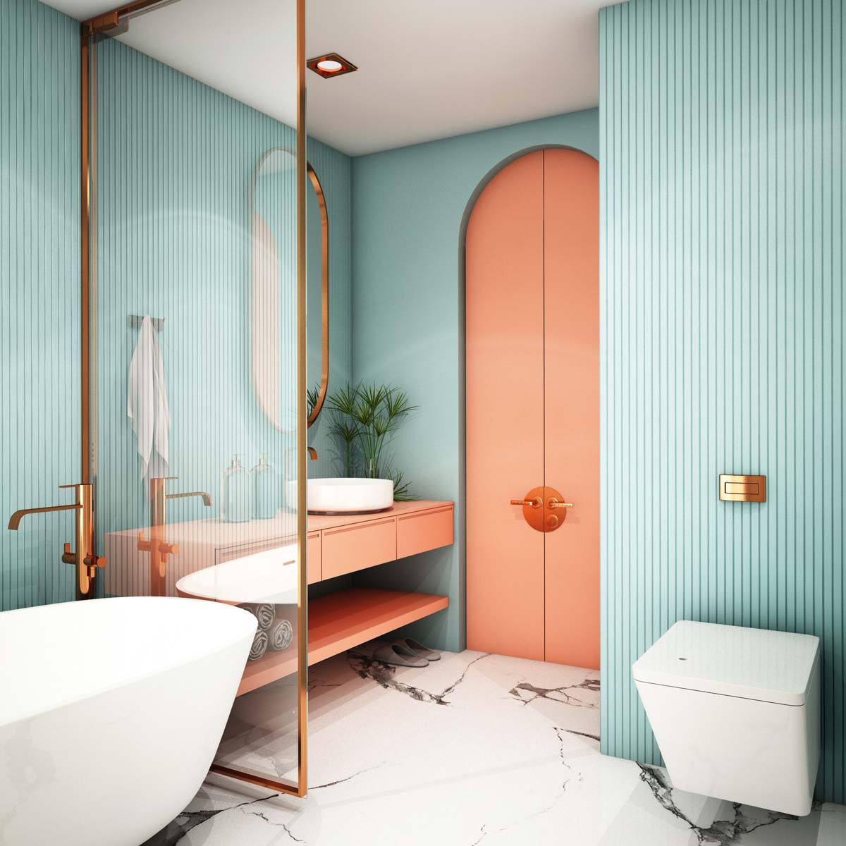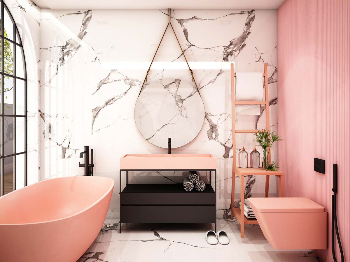 Ecco un bell’esempio di un bagno arredato con la prevalenza di colore corallo. In questo caso sono proprio i sanitari ad avere questa tonalità e anche la sedia con portasciugamani. Quest’ultima se non si trova già di questo colore, in genere, essendo di legno può essere ridipinta.