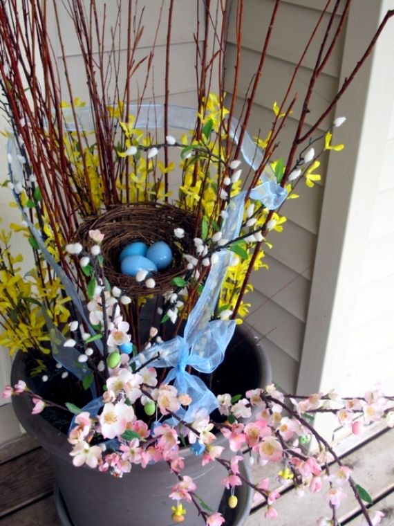 Un vaso vuoto può essere usato per ospitare una splendida composizione di Pasqua. Potrete decorarlo con rami di forsizia, ciliegio e altri fiori caratteristici della primavera. Al centro potrete inserire un nido con uova celesti, un immancabile addobbo di questo periodo.