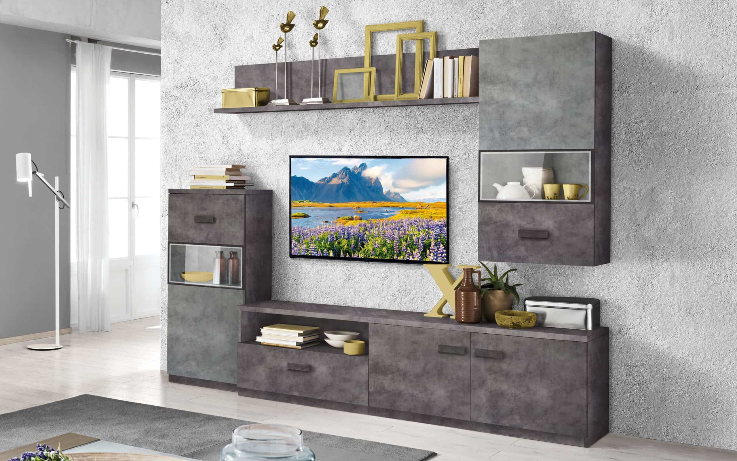 Urbino è la parete attrezzata funzionale, composta da vetrina, mensola, madia e porta tv che potete decidere di acquistare insieme o in prodotti singoli. La trovate in ossido/cemento oppure in effetto rovere beige.