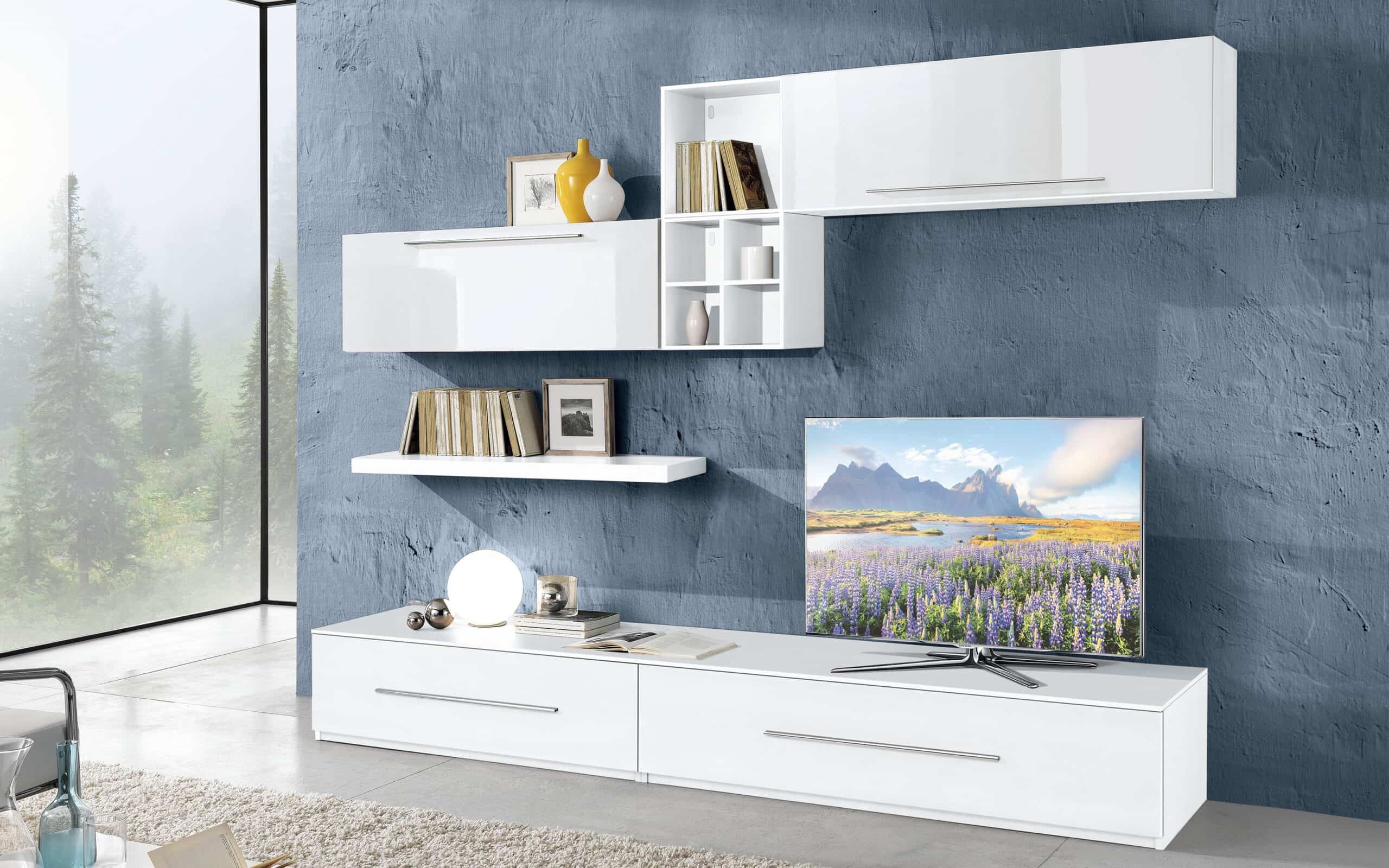 Gemini, ad esempio, è l’ideale per un soggiorno fatto con materiali componibili che si alternano tra di loro, per creare un effetto ultra moderno, agevolato dal colore bianco lucido, che rende tutto più luminoso. La trovate anche in effetto olmo/bianco lucido o in effetto olmo/bianco.