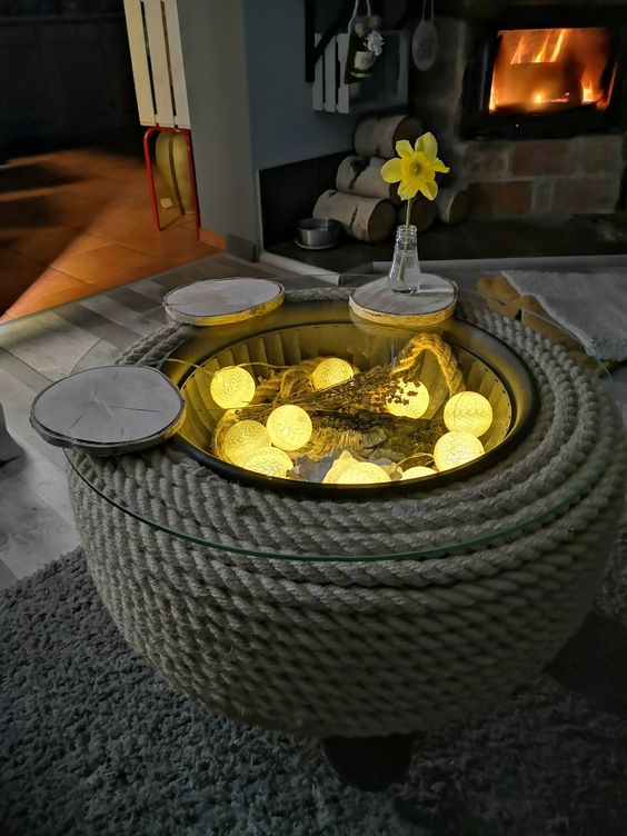 Ecco un’idea molto creativa per gli amanti di uno stile d’arredamento semplice e naturale. Non lo avreste mai detto, ma una corda può rinnovare un mobile intero! Se rivestite il vostro vecchio tavolino da salotto di corda e lo abbellite con semplici decorazioni luminose, otterrete un nuovo complemento d’arredo dal fascino unico.