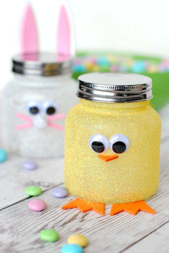 Per realizzare un divertente centrotavola possono essere utilizzati i barattoli in vetro. Ricoprendolo di colla vinilica e di brillantini gialli si crea la base su cui attaccare occhi, becco e zampette. Davvero divertente!