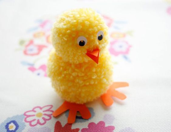 Realizzare i pon-pon di lana è davvero facile e si possono creare anche con i bambini. Attaccandone insieme due di dimensioni differenti si possono ottenere questi simpatici pulcini. Occhi, becco e zampe completano l’animaletto.