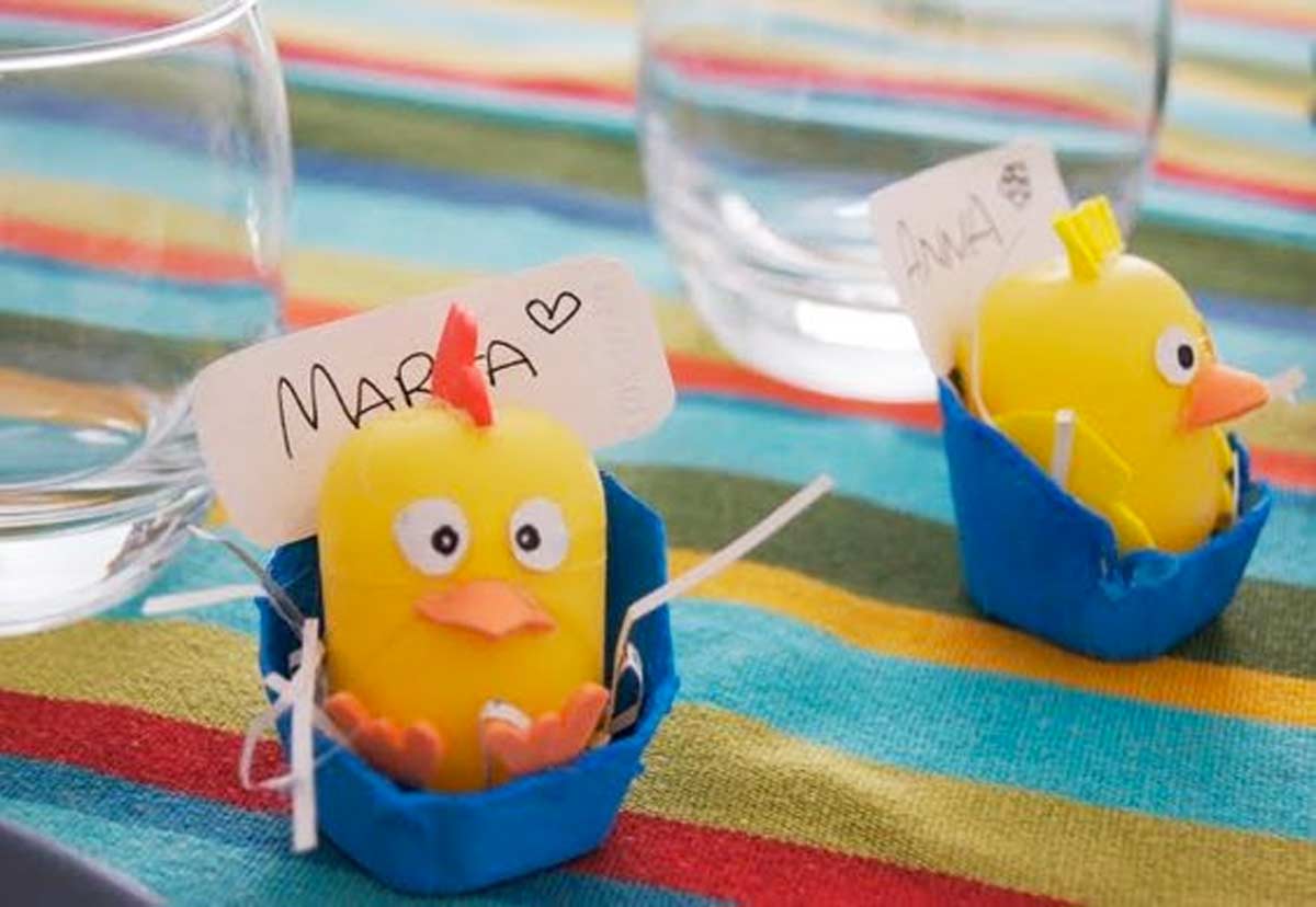 I pulcini di Pasqua possono essere utilizzati anche come segnaposto. Qui un esempio di riciclo creativo realizzati con gli ovetti e decorati con occhi, becco e cresta.