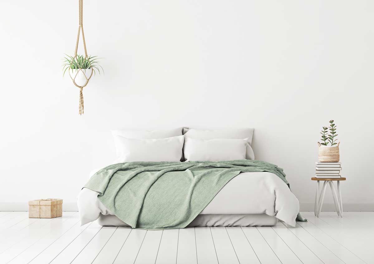 Per creare un’atmosfera riposante in camera da letto, non c’è nulla di meglio che scegliere colori della natura. In una stanza da letto dominata dal candore del bianco possono essere aggiunte delle piante e dei dettagli verdi che le richiamano, ad esempio nelle coperte, per un risultato elegante e raffinato.