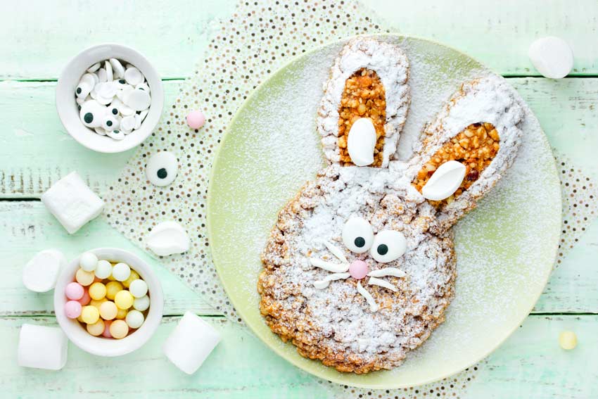 I più bravi in cucina potranno cimentarsi in una vera e propria torta a forma di coniglio pasquale con frutta secca e zucchero a velo.