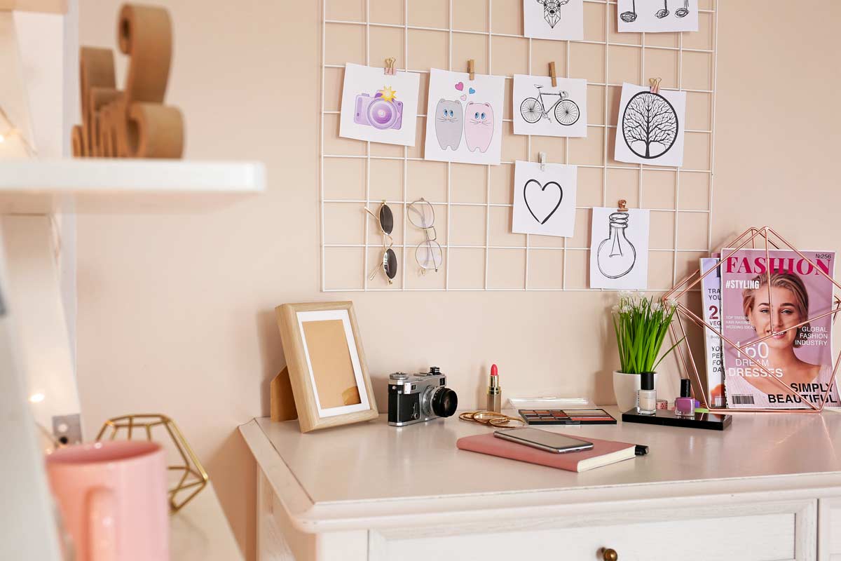 Guardate anche quest’altro esempio nello stesso stile ma allo stesso tempo differente, di sicuro meno minimal. La griglia appesa al muro è perfetta per appendere tutto quello che serve, a fare da sfondo vediamo il tortora rosato chiaro che fa risaltare i vari oggetti.