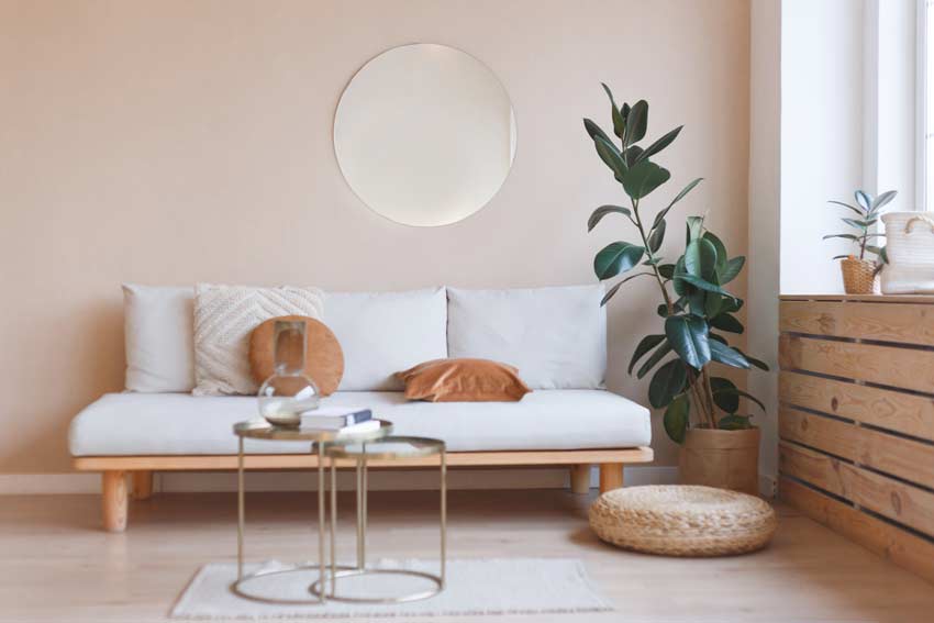 Una parete che presenta un tortora rosato dalla tonalità lieve, perfetta per un arredamento come quello scandinavo o boho chic, ma anche per altri stili di arredo. Gli elementi che compongono il salotto sono caratterizzati dalla presenza del legno in una colorazione naturale, un abbinamento perfetto con la parete. Il risultato è una stanza luminosa e spaziosa.