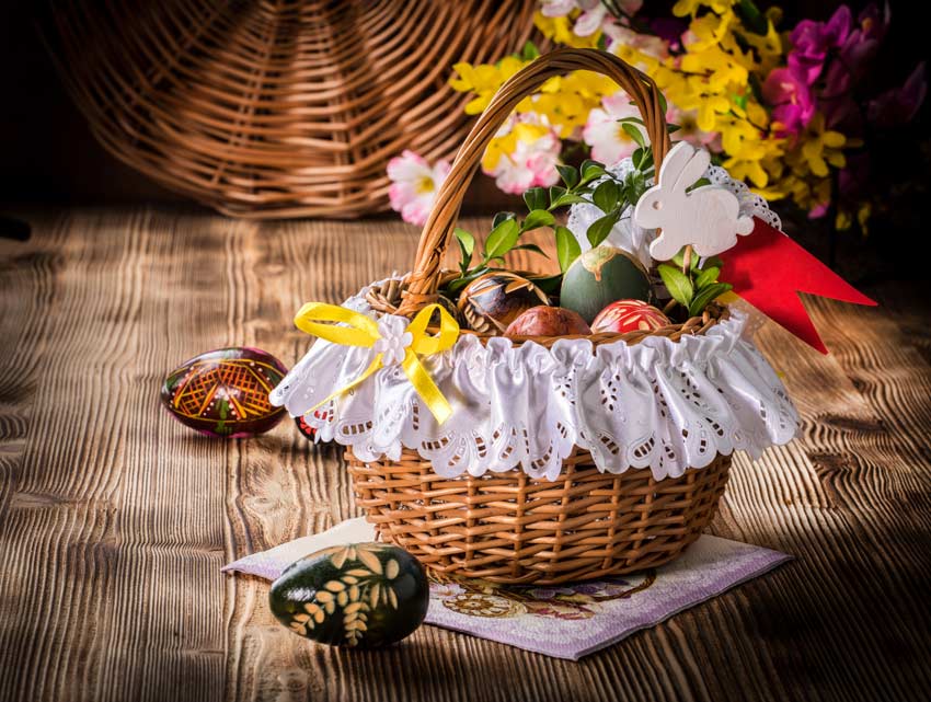 Il cesto pasquale con uova e fiori freschi