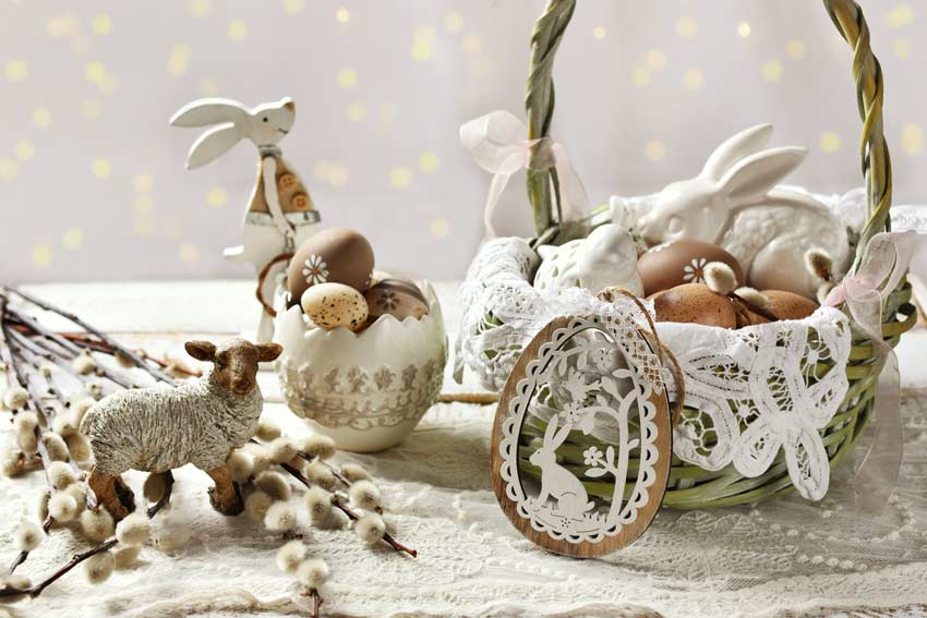 Un bel cesto di vimini bianco riempito di uova e fiori freschi, che è simbolo di Pasqua. Un cesto della festa che diventa una decorazione di prim’ordine e che al centro della tavola saprà farsi ammirare.