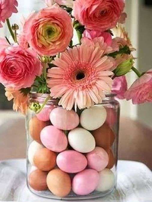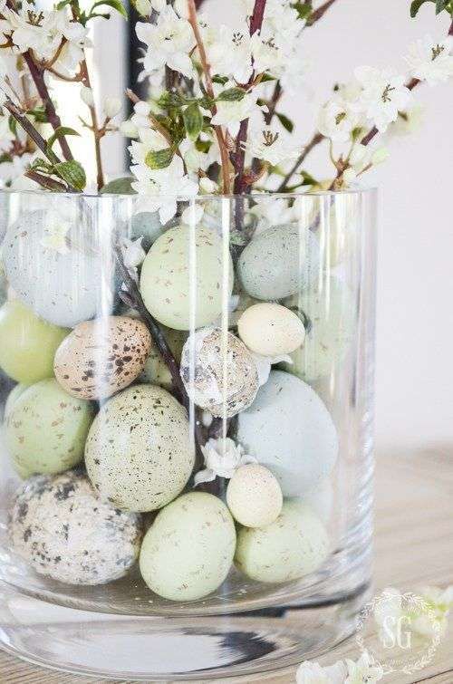 Non è necessario utilizzare molti elementi per creare un bel vaso di Pasqua. Ciò che vi serve è il contenitore giusto, tassativamente di vetro, se userete uova colorate. Potrete focalizzarvi sulle sfumature diverse e la resa estetica sarà comunque degna di nota.