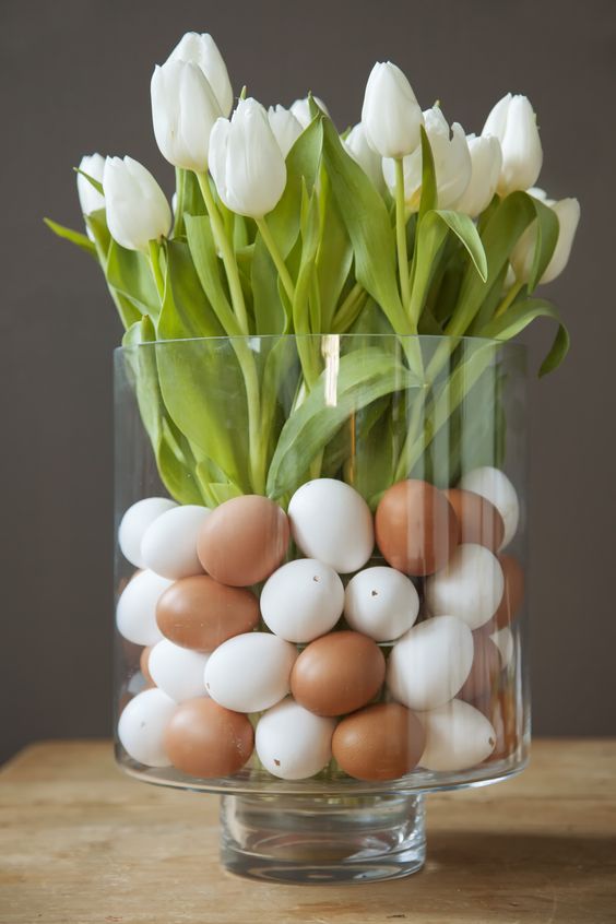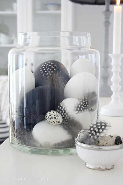 Chi, al contrario, predilige l’eleganza anche nei piccoli dettagli, dovrebbe valutare colori classici, come il nero e il bianco. Un semplice vaso in vetro con uova e piume, senza troppi elementi, vi permetterà di realizzare un progetto minimalista e chic nello stesso tempo.