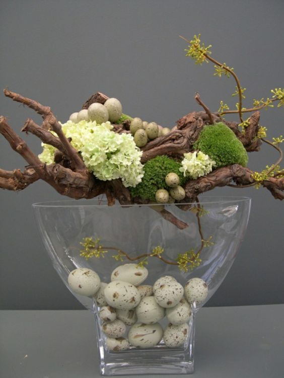 Ecco un’idea davvero suggestiva, se volete realizzare un vaso pasquale fuori dall’ordinario. Dovrete procurarvi un piccolo tronco attorcigliato che impreziosirete con diversi elementi. Giocate con ciò che la natura e la Pasqua vi ispirano in questo periodo! Dopodiché, appoggiate la vostra opera sopra un recipiente dal design altrettanto ricercato e otterrete un vero e proprio capolavoro.