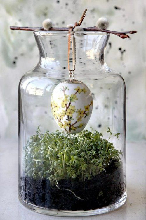Chi sa dipingere bene, potrà scatenare il proprio estro grazie a questo progetto. Vi basterà un unico uovo, appeso a un ramo e disposto al centro del vaso, sopra un mini terrario, per ottenere un effetto wow!